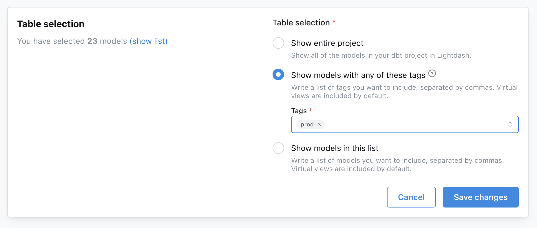 2. Show models with any of these tags: This option depends on dbt tags. You can learn more about using tags to manage your project here. If you already have a specific model tag (or tags) you want to limit Lightdash to using, this is where you can add them in. For example, all of our production models have the tag prod, so we’ve configured our Tables using that tag.