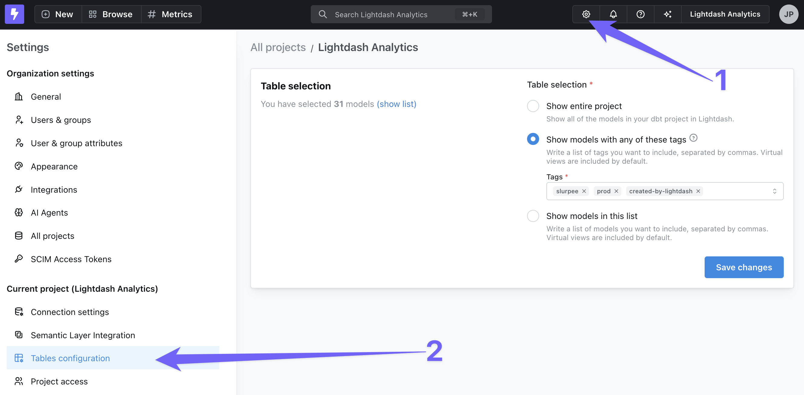 Sometimes, there are models in our dbt project with YAML files that we might not want to appear in Lightdash (staging tables, I’m looking at you 👀). So, we’ve made it possible for you to configure which Tables you want to appear in Lightdash. To get to your table settings: