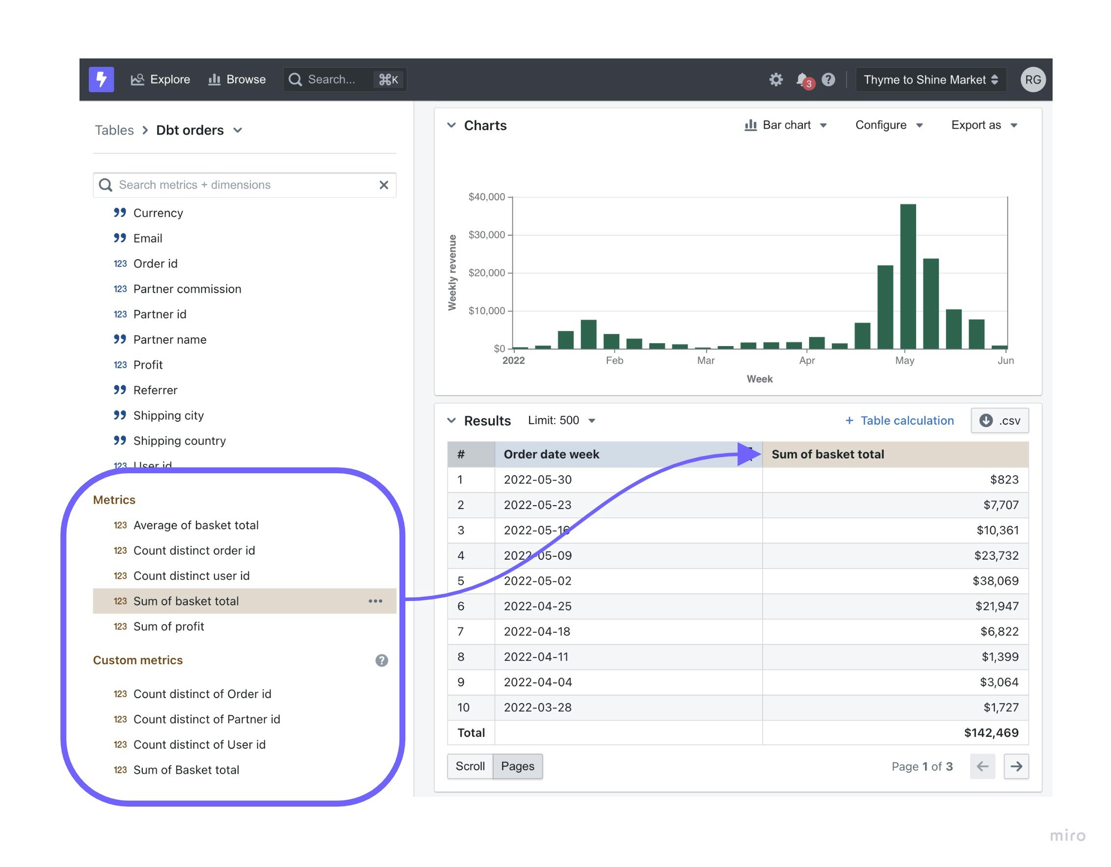 , we may want to know the “Total number of orders” or the “Total sales” of the orders. These calculations are metrics: