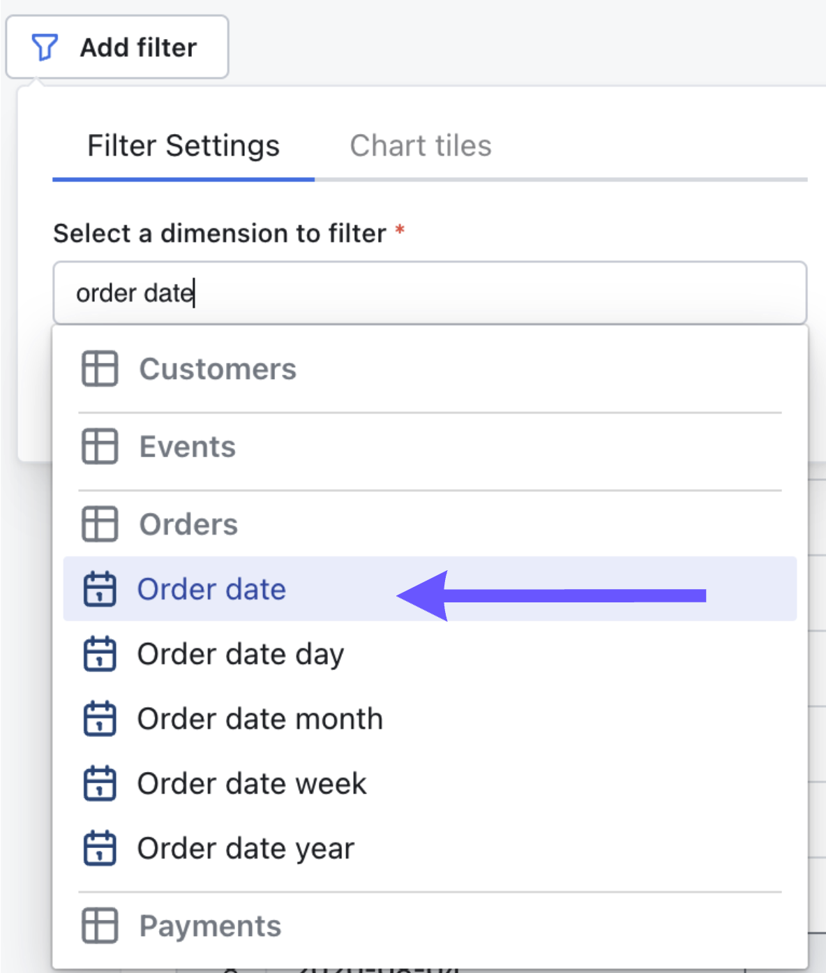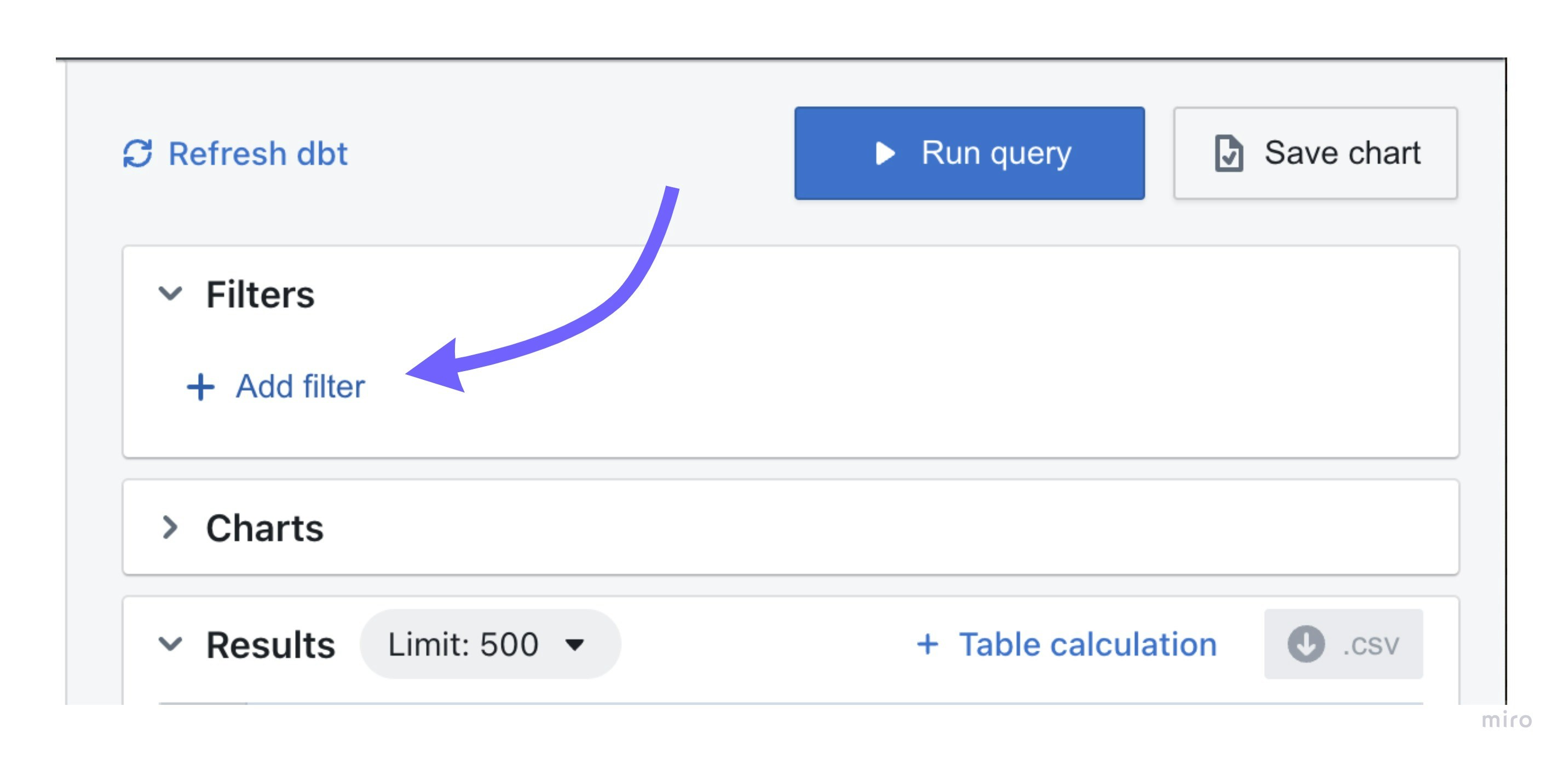 • On a dashboard with only SQL Runner-based tiles, filters are created a little differently since SQL charts are based on columns instead of semantic fields.