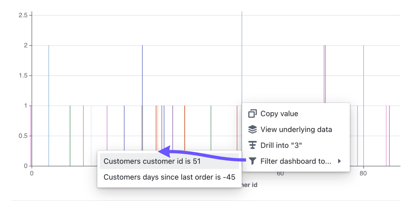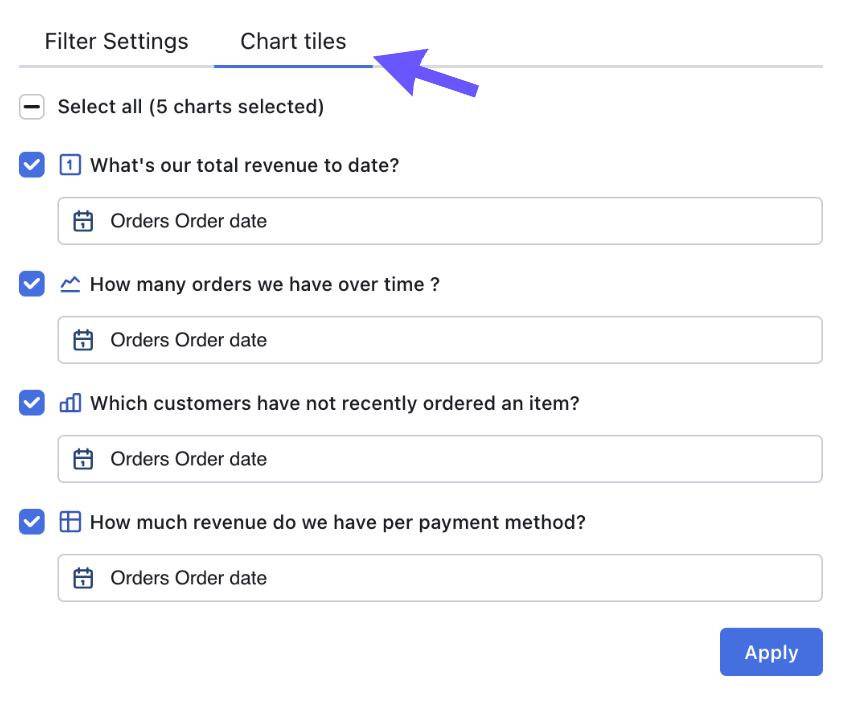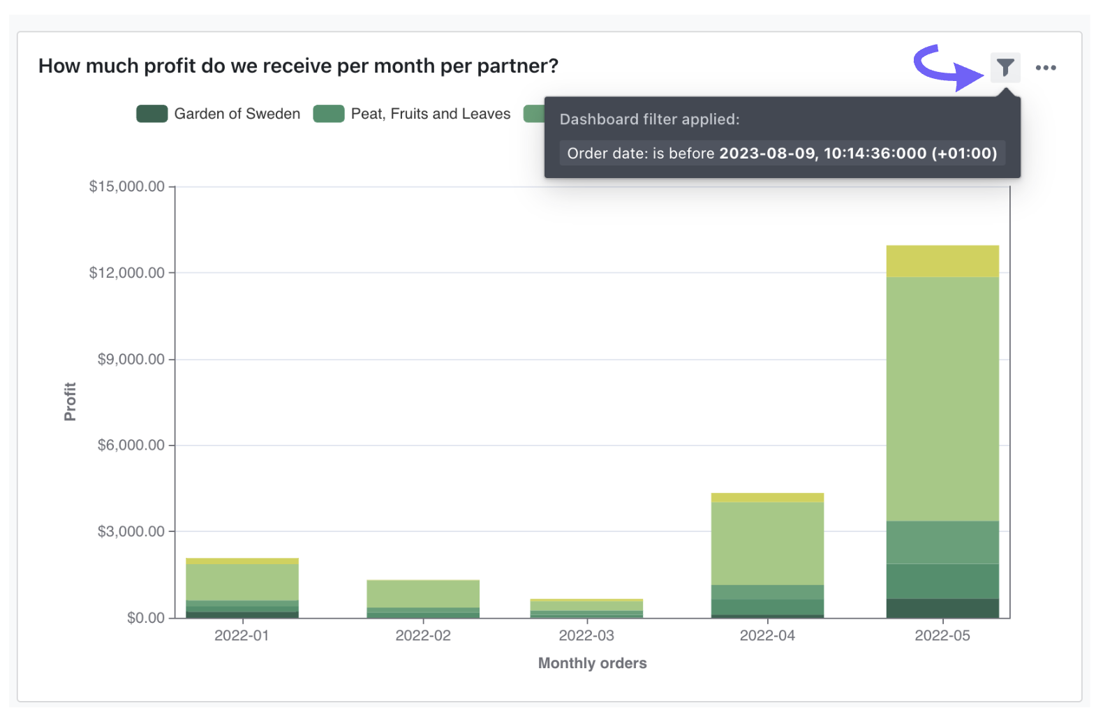 For example, if I had a chart for Sales in Asia and I filtered to country is China, India, Japan. Then, on my dashboard I added a filter country is India. My saved chart’s filter would be removed, and my new dashboard filter would be applied instead, so the tile in the dashboard would be filtered to: country is India. Here’s another example using a date filter: If my original saved chart was filtered to only include orders completed on or after April 3rd, 2024. But, I add a date filter to my dashboard to include orders completed on or after August 1st, 2024, then the dashboard filter would override the saved chart filter and I’ll end up with the chart filtered by orders completed on or after August 1st, 2022. How charts work in this context: