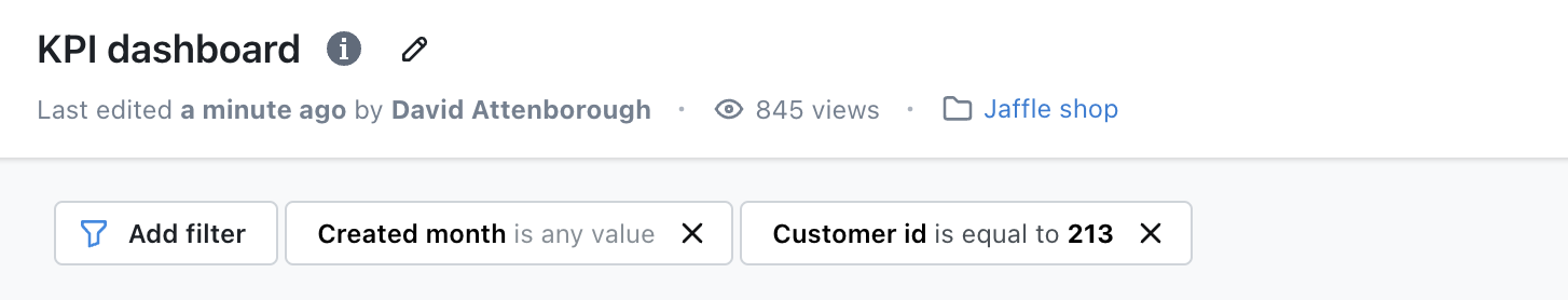 If you add a temporary filter to your dasboard, then only you will see the filters you’ve applied (you won’t be changing the dashboard for everyone who comes to look at it). If you want to save the dashboard filters you’re adding, then check out adding saved filters to your dashboard. There are two ways to add temporary filters to your dashboard.