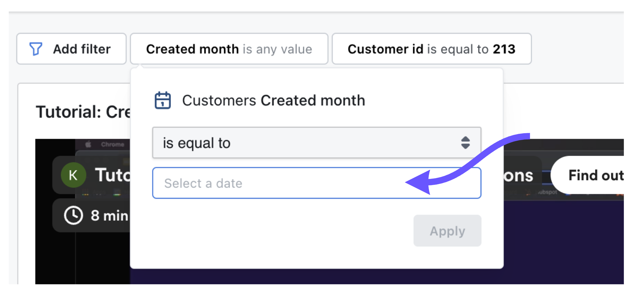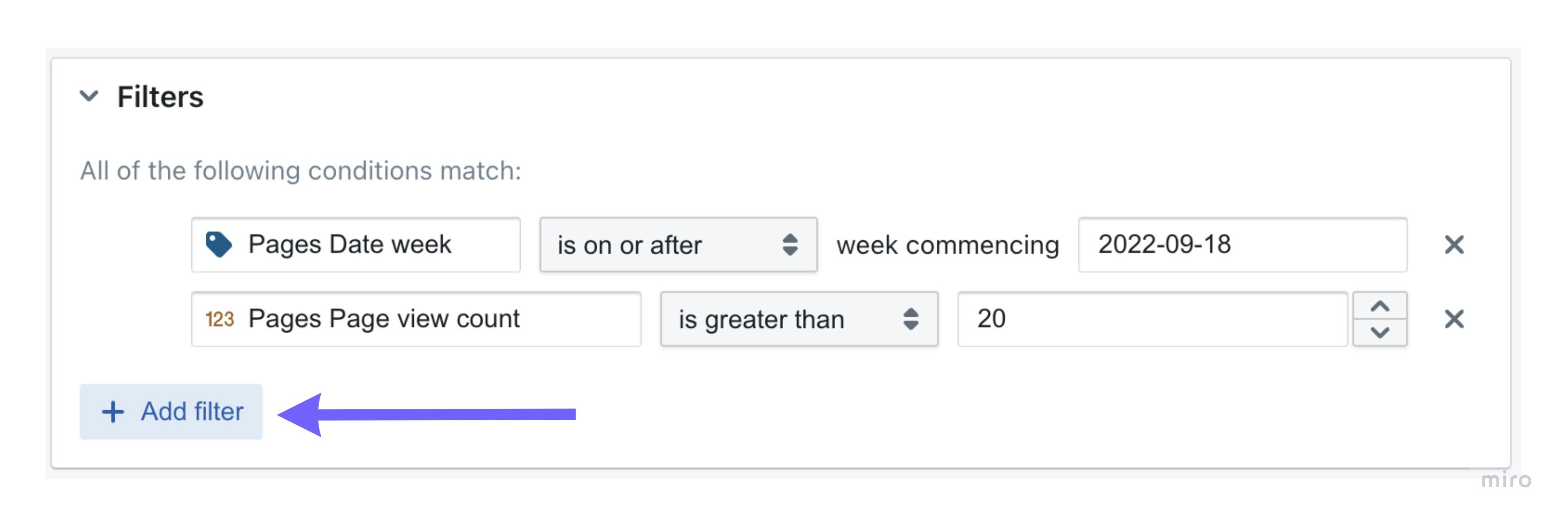 2. Click add filter, then specify the field that you want to filter on and the value you want to filter by.