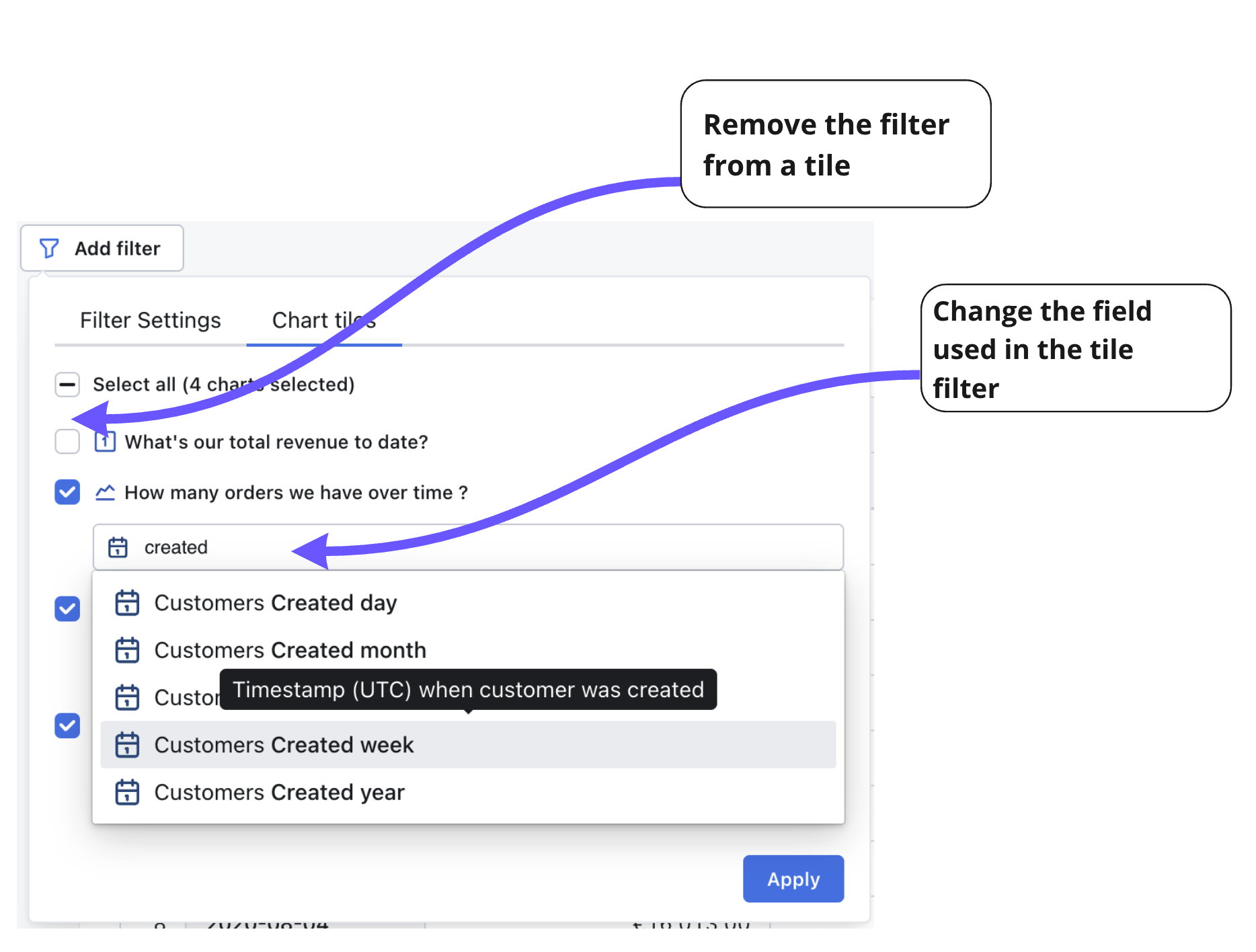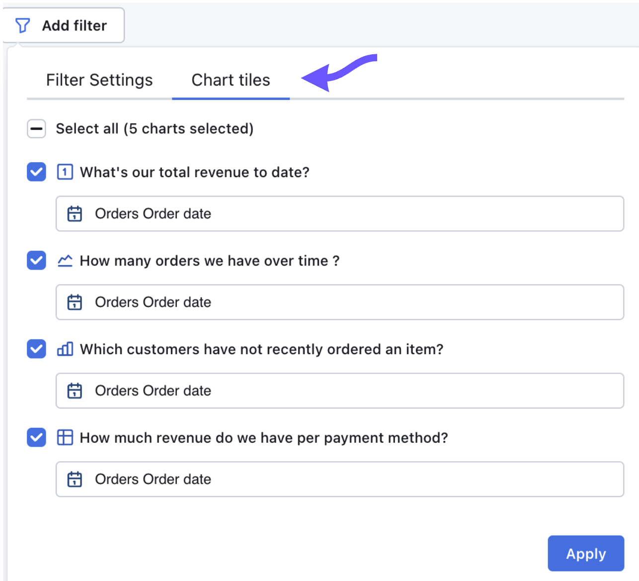By default, the new filter will be applied to every column on the dashboard that has the same name as the filtered column. You can also choose, in the Chart tiles tab of the filter dropdown, exactly which tiles and columns to apply it to. Note that as with Explorer-chart filters, you can only apply fitlers to dimensions (in this case, non-aggregated columns).