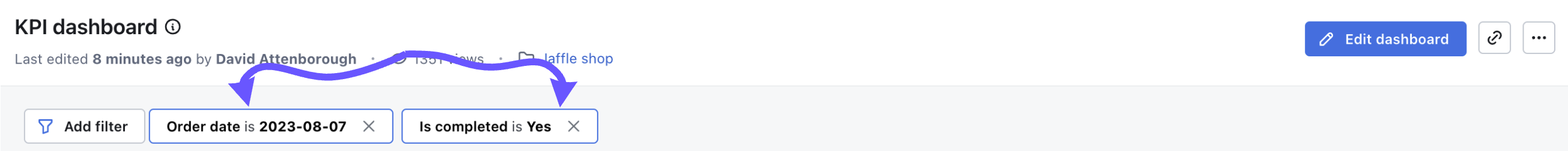 Here’s another example using a date filter: If my original saved chart was filtered to only include orders completed on or after April 3rd, 2022. But, I add a date filter to my dashboard to include orders completed on or after August 1st, 2022, then the dashboard filter would be added to the saved chart filter and I’ll end up with the chart filtered by orders completed on or after August 1st, 2022.