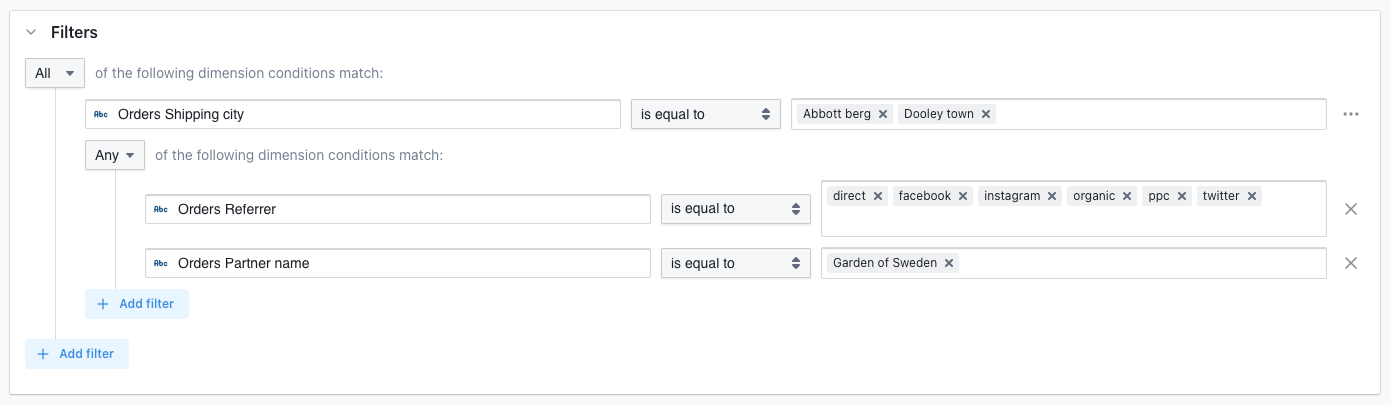 1. Click add filter, then specify the dimension or metric that you want to filter on.