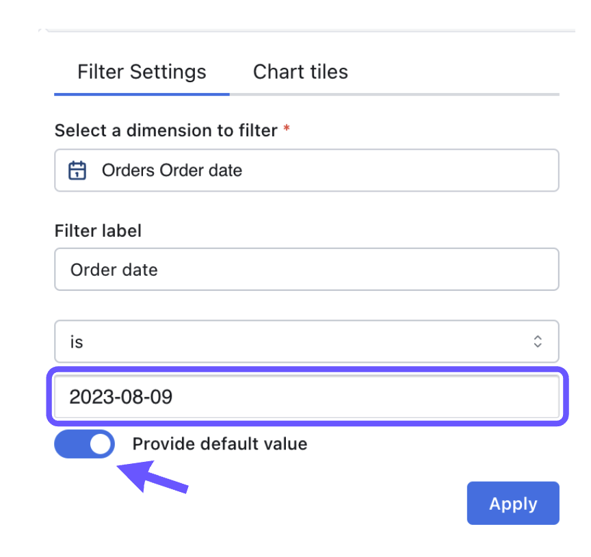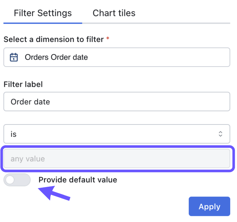 If you want to specify a value, ensure you toggle ‘Default value’ so that you can apply a filter to the tiles in your dashboard.