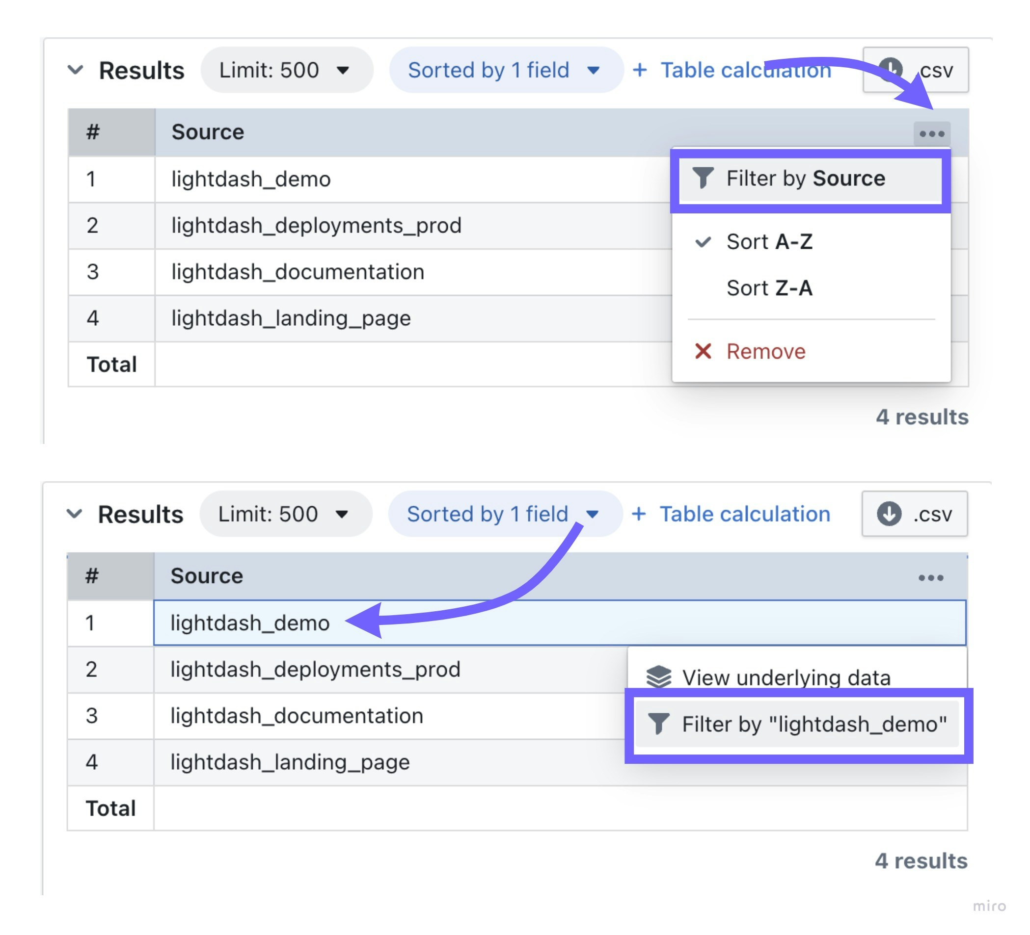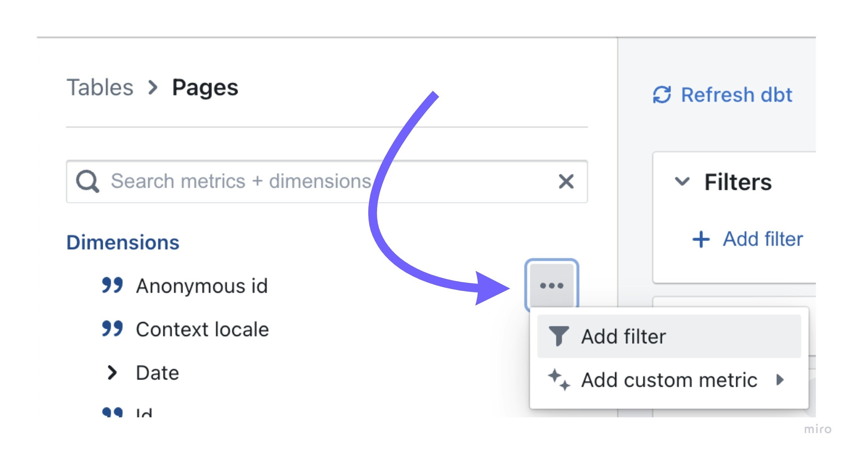 Once you have some results in your results table, you can add filters by clicking on the three-dot menu of the column you want to filter on, or by clicking on the value you want to filter by.