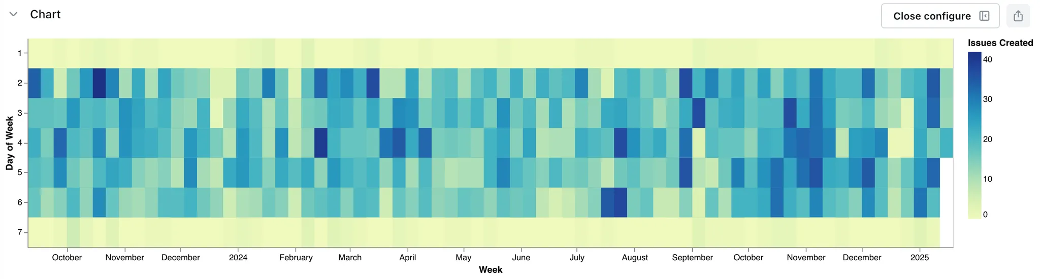 This chart works best with string or date dimensions and a numeric metric as color. The config below will output a heatmap with the standard Vega-Lite settings that looks like this: