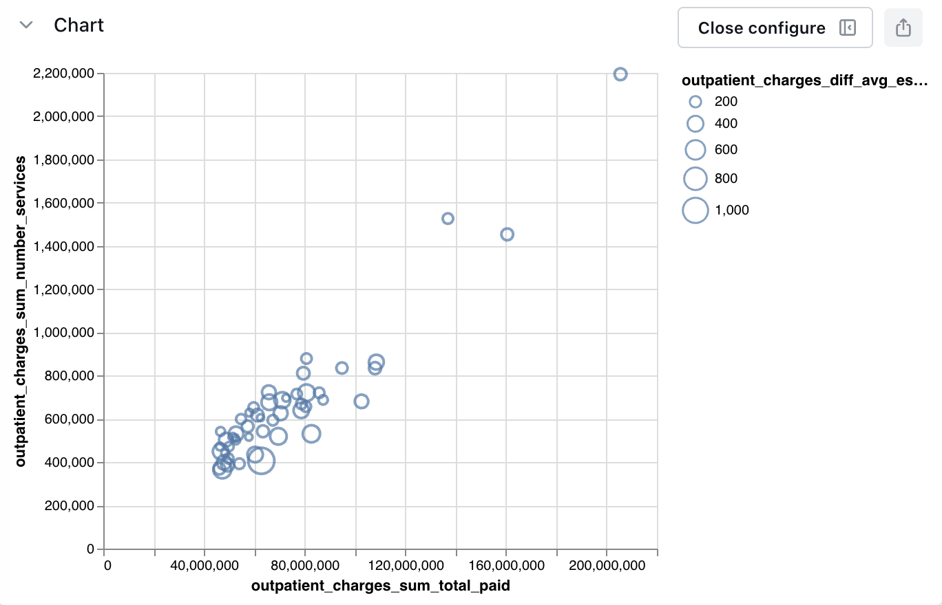 Bubble plots build on top of standard scatter plot visualizations, by allowing you to adjust the size of a given point based on the output of a field. Here’s one looking at some Healthcare data. This chart works best with string or date dimensions and a numeric metric for the y-axis and another numeric metric for the size. The config below will output a bubble plot with the standard Vega-Lite settings, like this: